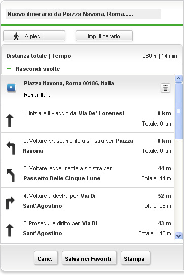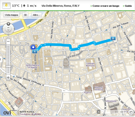 Cliccando su “Itinerari” viene richiesta l’installazione del plugin per Firefox delle Mappe. Calcolo un percorso a piedi per la Fontana di Trevi. Sono 960 metri, percorribili in 14 minuti. Posso anche vedere le svolte.