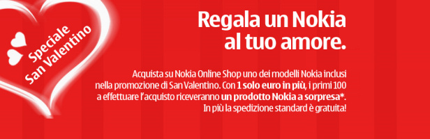 Acquistando uno dei modelli della promozione Regala un Nokia al tuo amore e aggiungendo un euro i primi 100 acquirenti riceveranno un regalo Nokia a sorpresa. Spedizione gratuita.